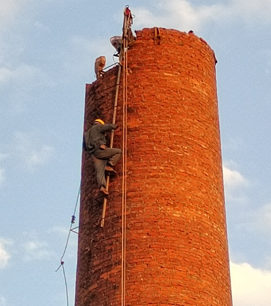 1、首先安排持有高空作业证及经验丰富的施工人员并佩戴好安全三宝,携带一根直径l8棕绳和1吨的滑轮缠绕一圈在腰间,顺沿烟囱筒壁爬梯向上慢慢稳定攀登,在攀登过程中需注意身体及安全歇息。同时在安排剩余高空作业人员按照安全要求依次向上攀登。
