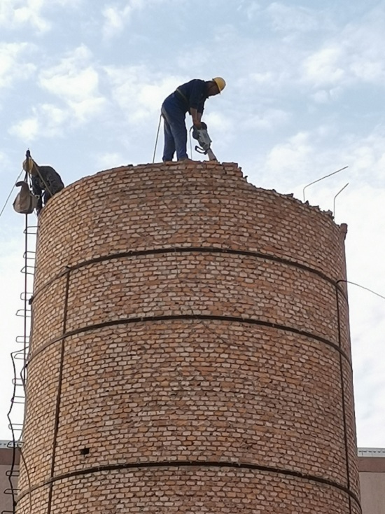 9、拆除工具使用电镐、大锤、凿子等工具,二人一组配合,以此类推往下拆除砖烟囱。