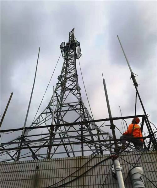 2、根据该基站在城区电信大楼上,无法选择好合理位置打下缆风桩,拔杆选用站角形,与塔中心固定拔杆相比无需缆风绳。在塔上安装固定好拔杆,系好拔杆与塔身主材连接钢丝绳。